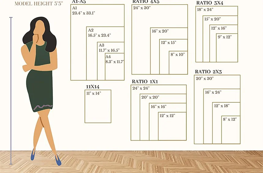 Wall art print sizing chart to help you select the perfect size for your home decor needs.